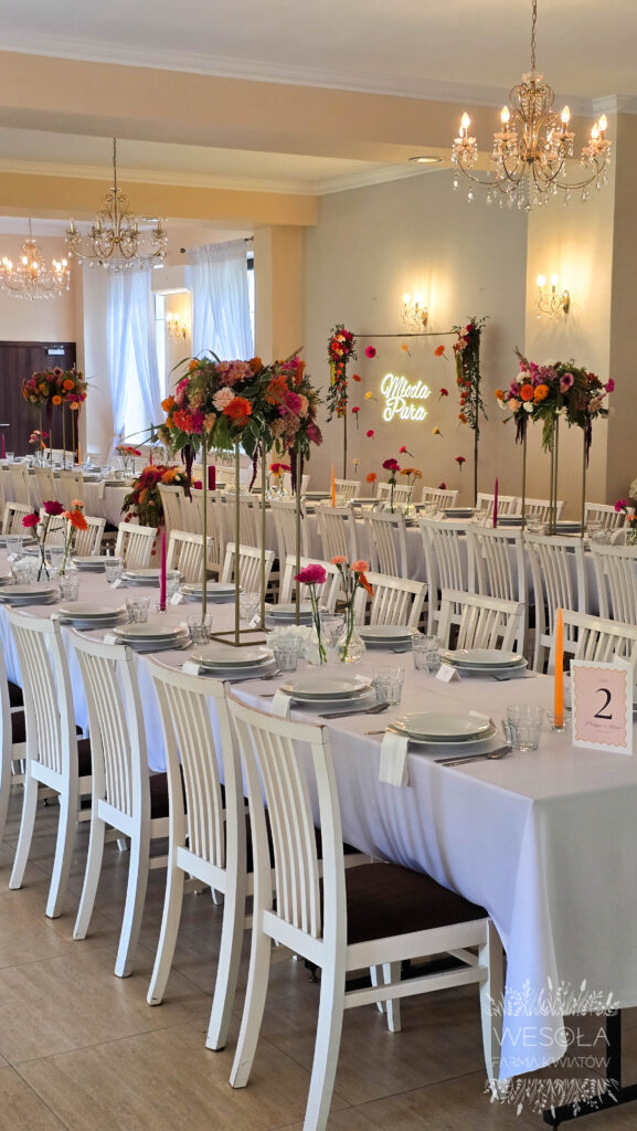 - plan stołów udekorowany kwiatami.