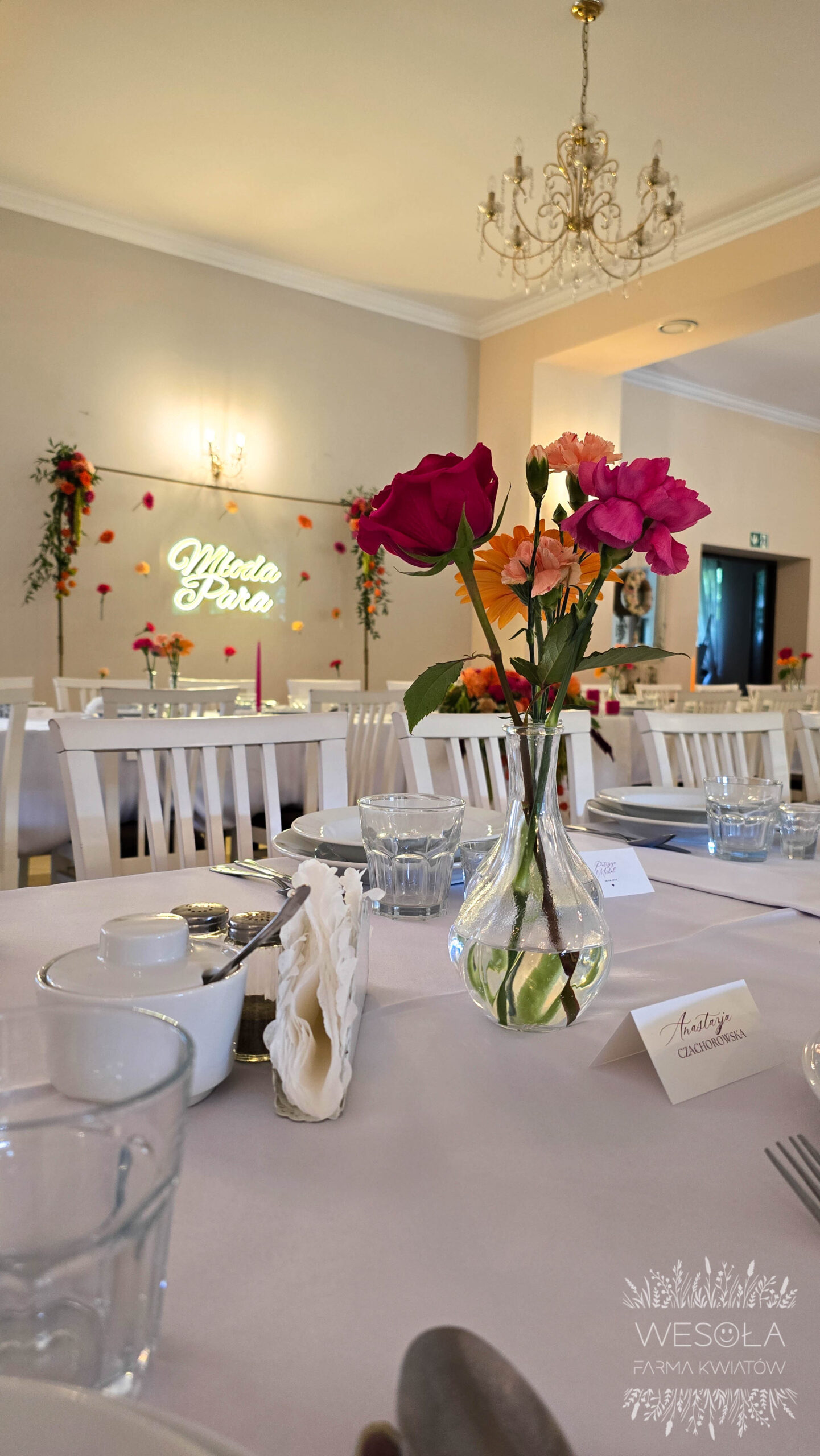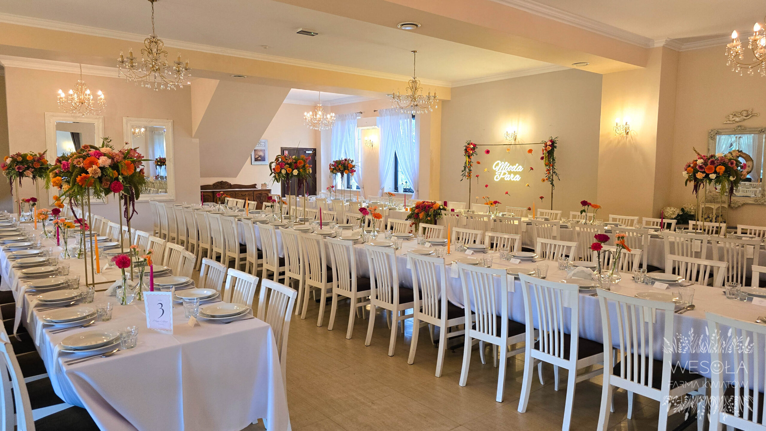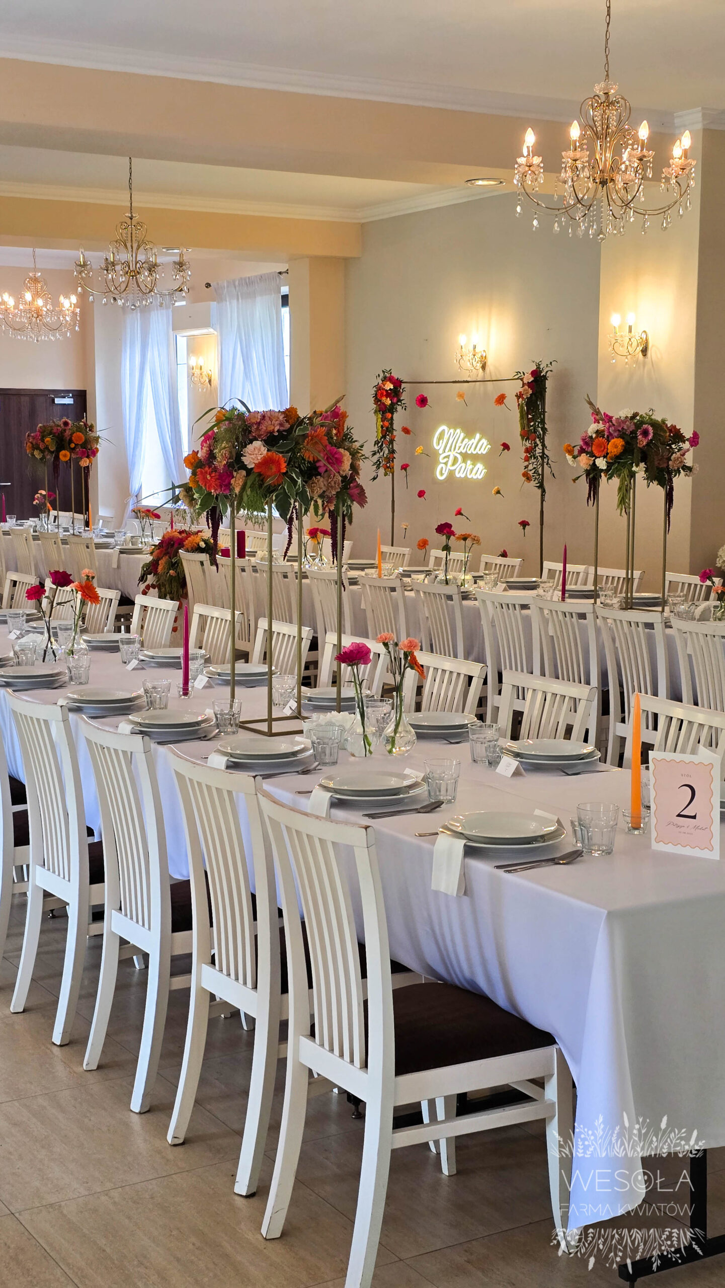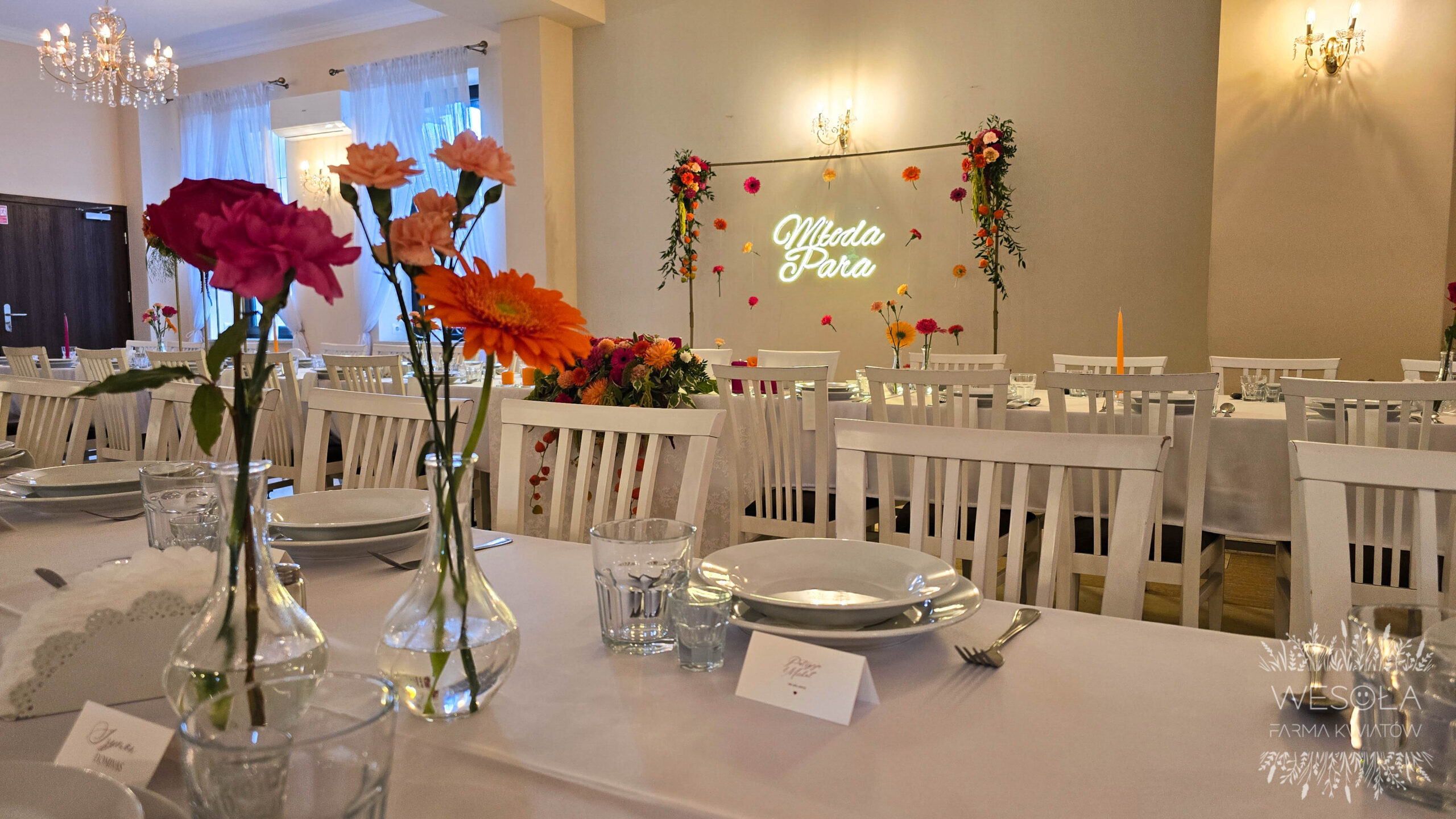 - napis LED „Młoda Para” na ściance kwiatowej umieszonej za krzesłami Młodej Pary,
