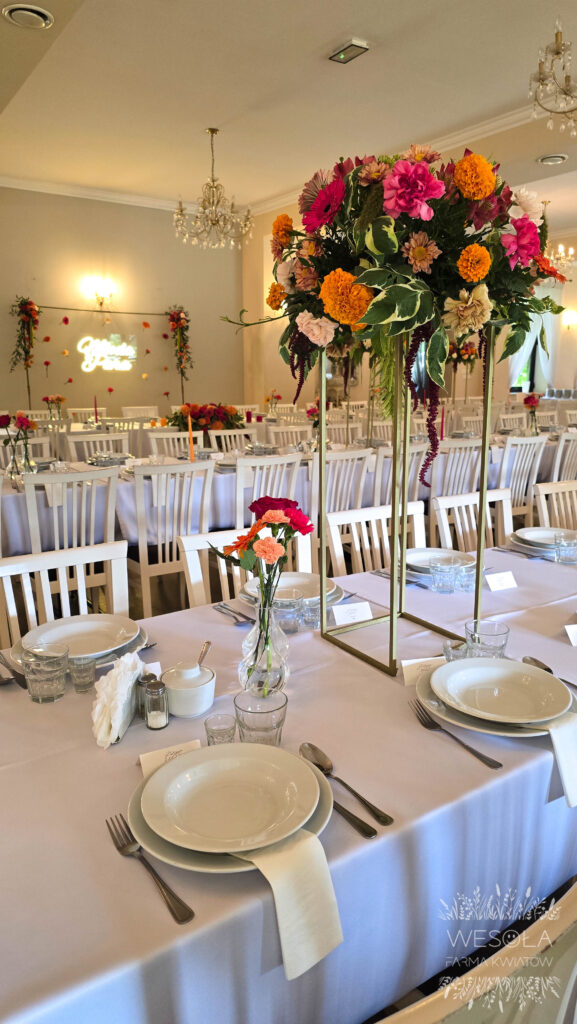 - duże bukiety na podwyższeniach na stołach,