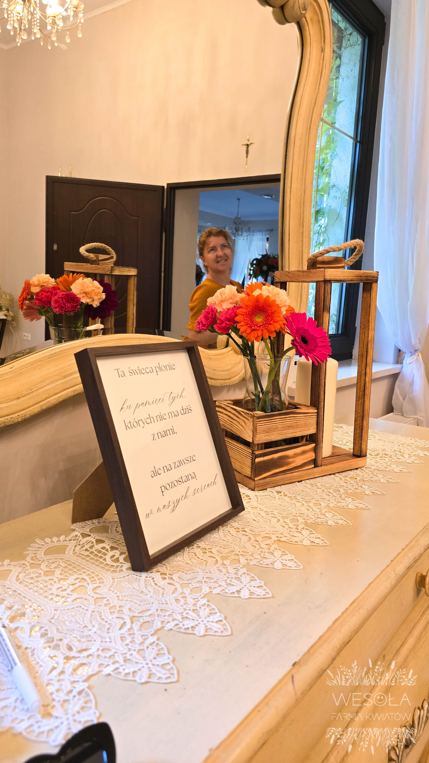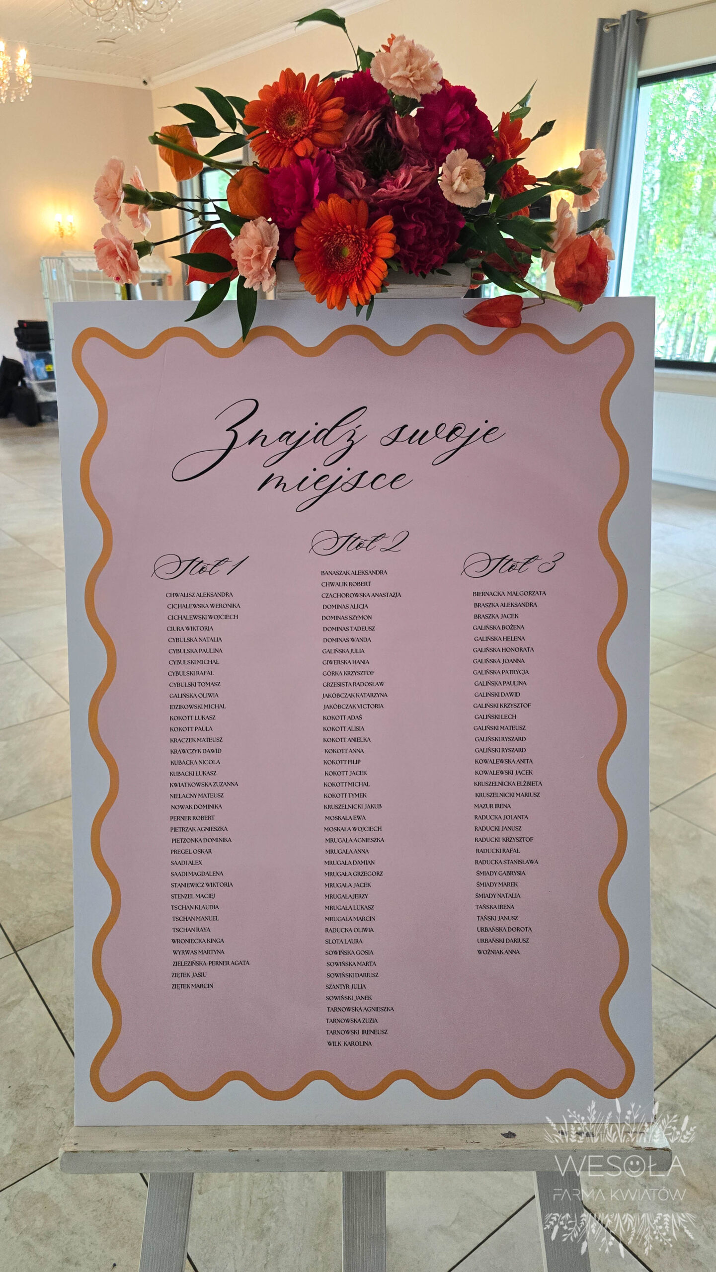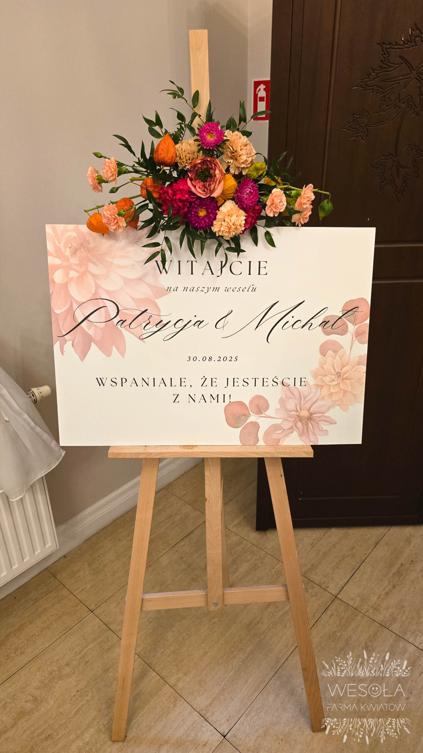 - personalizowana tablica powitalna na drewnianej sztaludze z dekoracją kwiatową,