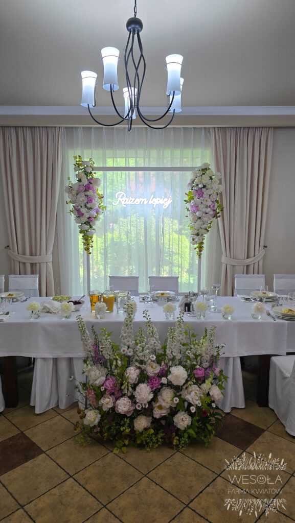 - duża kompozycja kwiatowa przy stole Pary Młodej oraz na ściance,