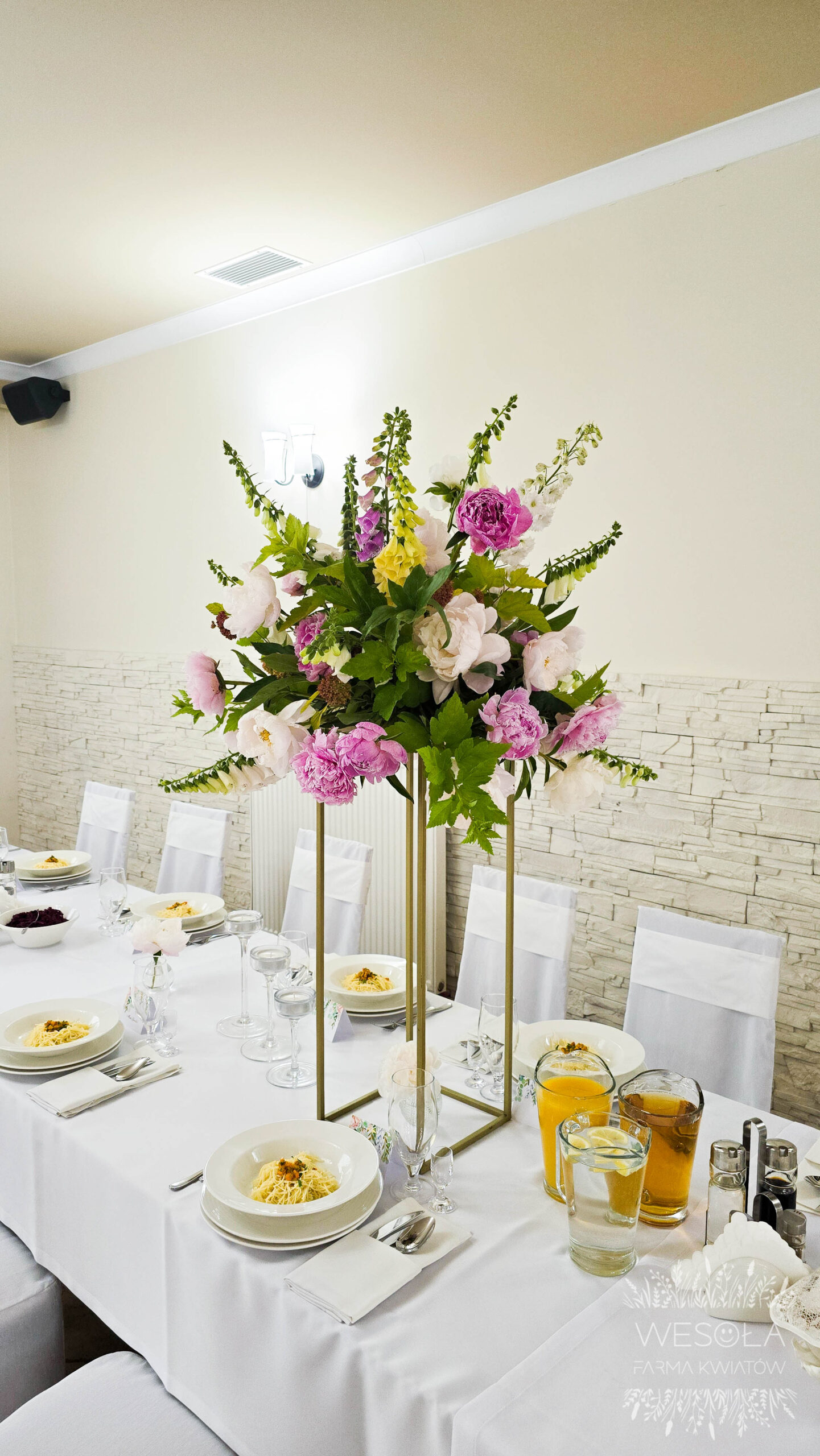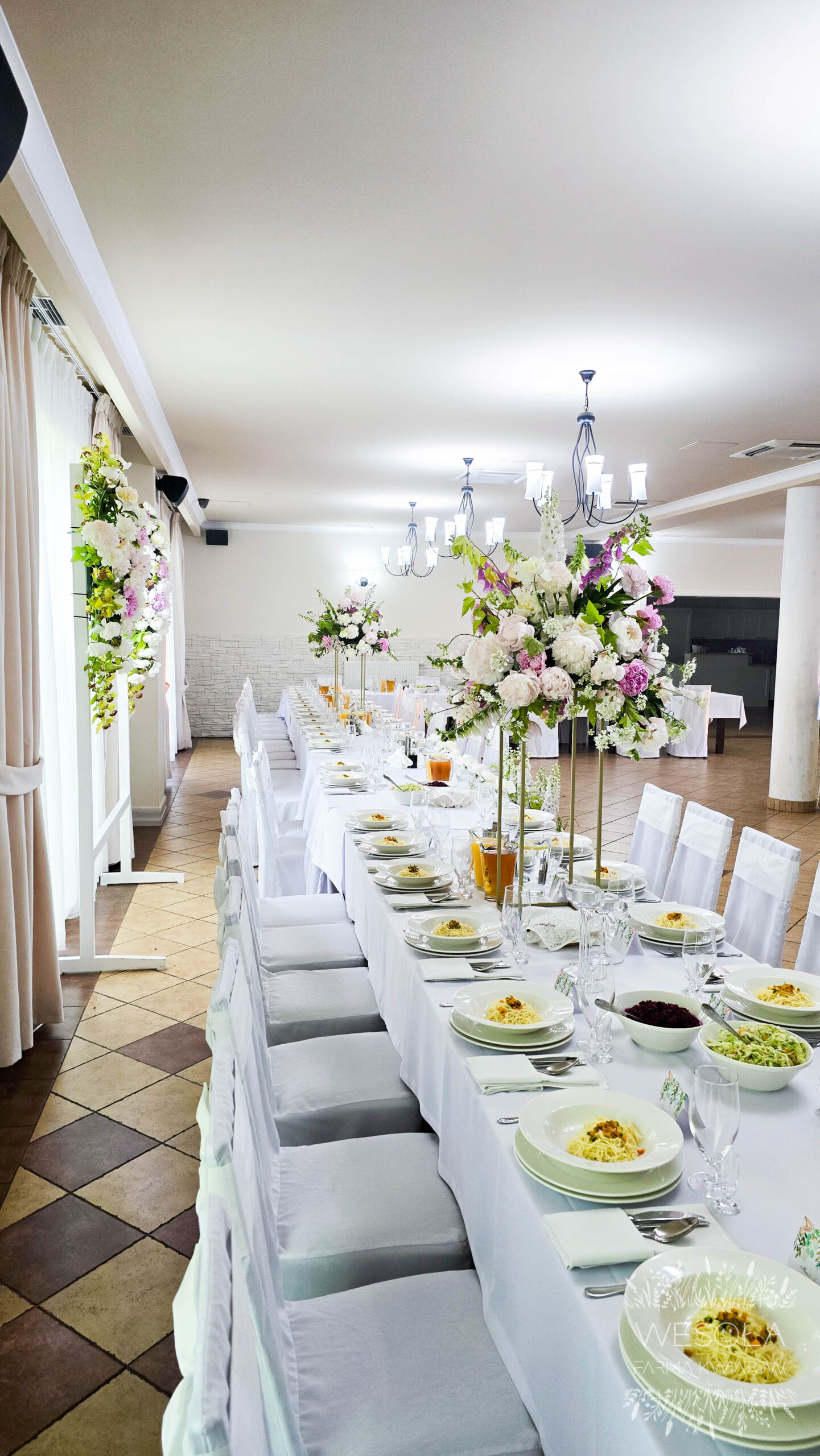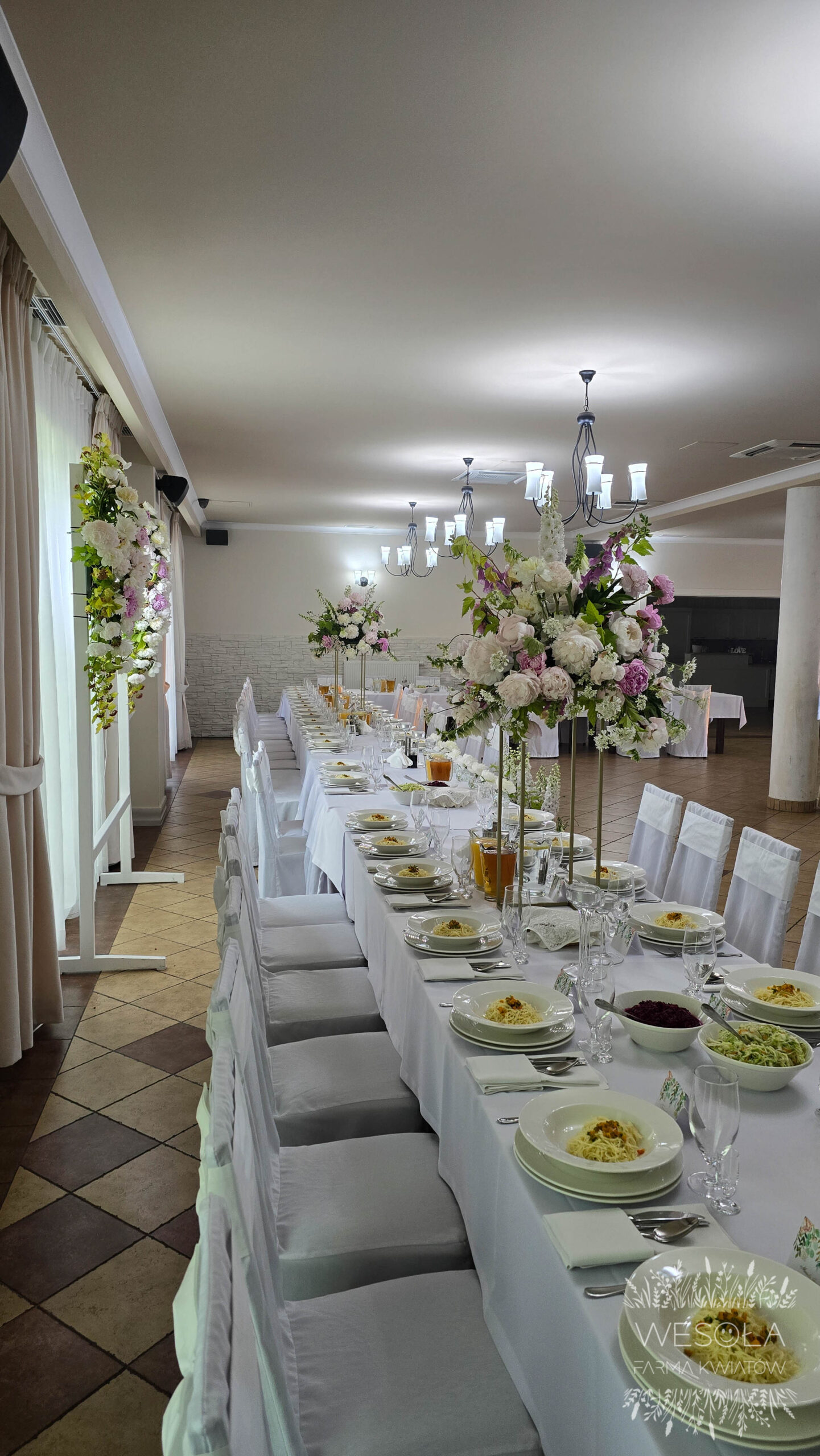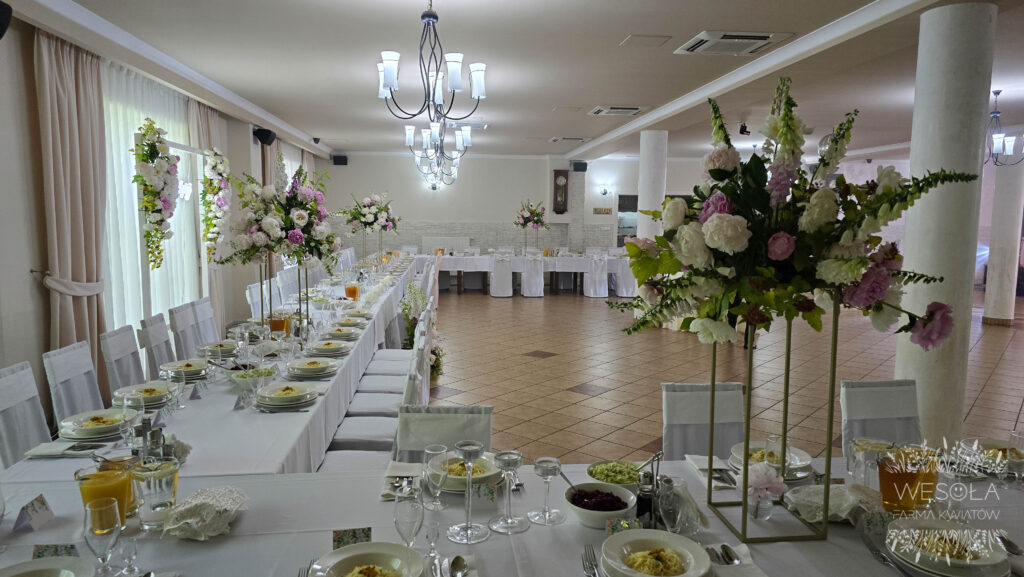 - duże bukiety na podwyższeniach na stołach,